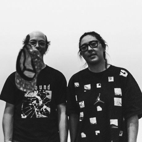 A black and white photograph of two people looking directly at the camera is shown. Nick Butcher and Nadine Nakanishi stand side by side, and are pictured from the waist up. They are both wearing black t-shirts with bright printed graphics. Arms to their sides, both look directly into the camera. The image field is complicated by a blurry hat, caught falling through the frame, mid motion. The hat partially obscures Nick’s face.